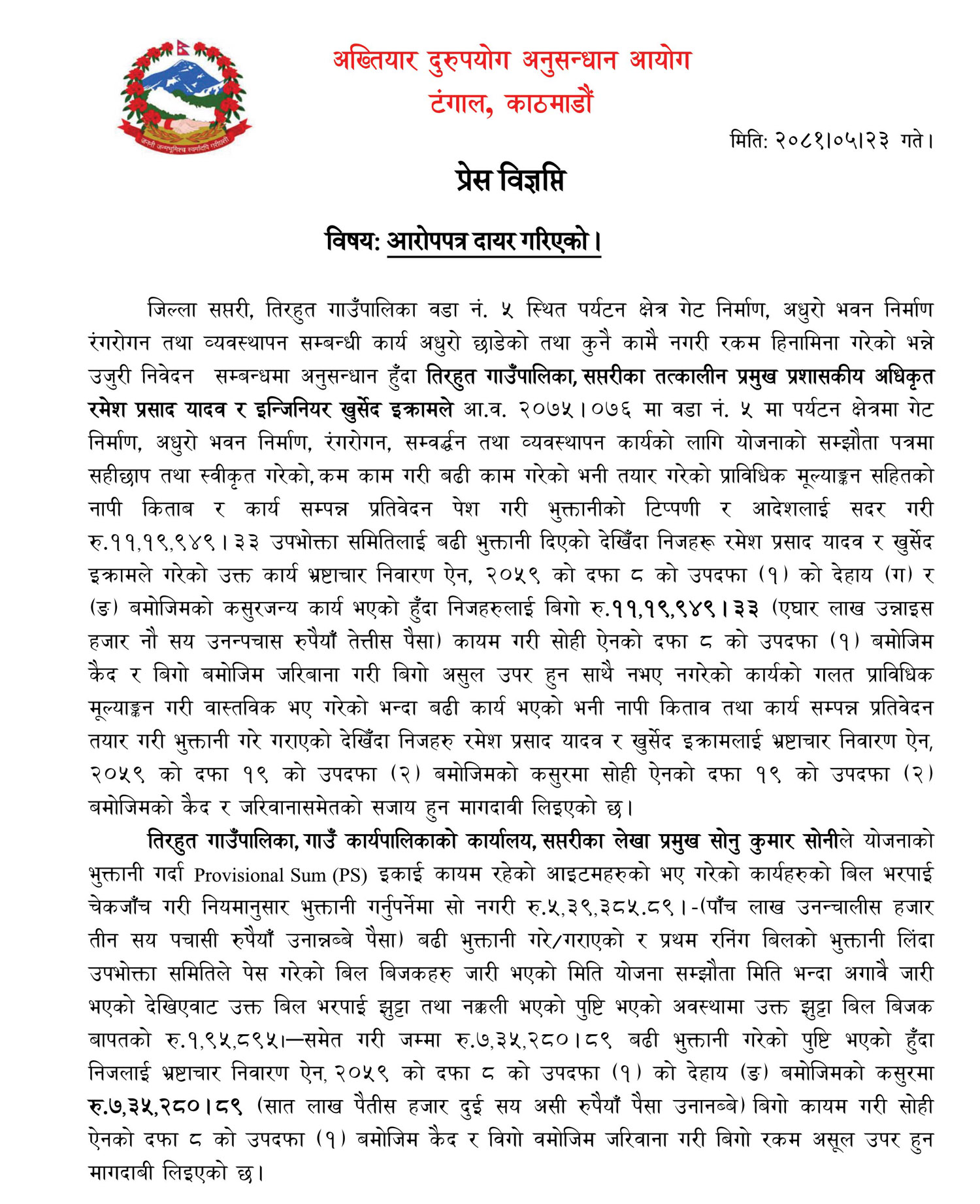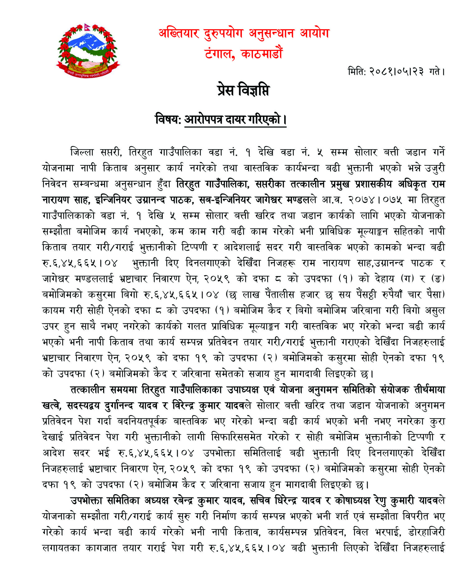 तिरहुत–५ स्थित पर्यटन क्षेत्र गेट निर्माण, अधुरो भवन निर्माण, रंगरोगन तथा व्यवस्थापन सम्बन्धी योजना तथा वडा नं. १ देखि ५ सम्म सोलार वत्ती राख्ने योजनामा काम नै नगरी रकम हिनामिना गरेको आरोपमा अख्तियार दुरुपयोग अनुसन्धान आयोगले आइतबार उनीहरुविरुद्ध मुद्दा दायर गरेको हो।