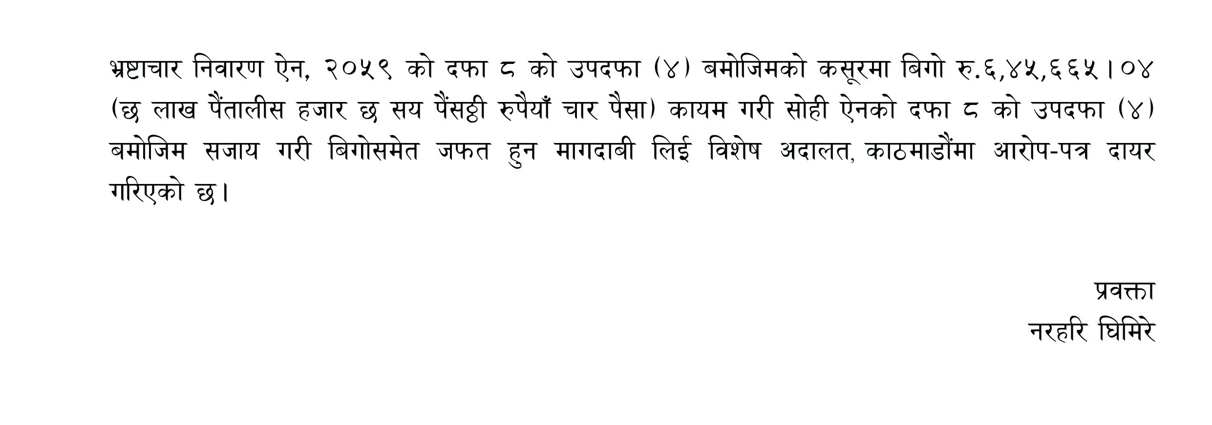 उक्त कार्य भ्रष्टाचार निवारण ऐन, २०५९ को दफा ८ को उपदफा (१) को देहाय (ग) र (ङ) बमोजिमको कसुरजन्य कार्य भएको भन्दै अख्तियारले उनीहरूविरुद्ध मुद्दा चलाएको हो । दुवैजनामाथि ११ लाख १९ हजार ९ सय ४९ रुपैयाँ ३३ पैसा विगो र जरिवाना मागदावी कायम गरी मुद्दा दर्ता गरिएको अख्तियारले जनाएको छ ।