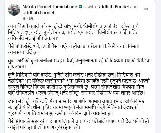 ‘कुनै मिडियाले यति करोड, कुनैले उति करोड भनेर लेखेका छन्। मिडियाले धर्म नछोडेको भए बैंकिङ कारोवारको अंक सबैमा ठ्याक्कै एउटै हुनुपर्ने होइन र ?’ भन्दै उनले लेखेकी छिन्– ‘समाचार लेख्नेमाथि दया लागेर आउँछ। खाता मेरो हो। यति–उति पैसा छ भनेर आफैं अनुमान लगाउनुभन्दा सोधेको भए बताइदिन्थे नि! श्रीमान् हिरासतमा भएको बेला ममाथि केही मिडियाले देखाएको ‘पुरुषार्थ’ अगाडि समाज मुकदर्शक बनेकोमा झनै आश्चर्यमा छु।’