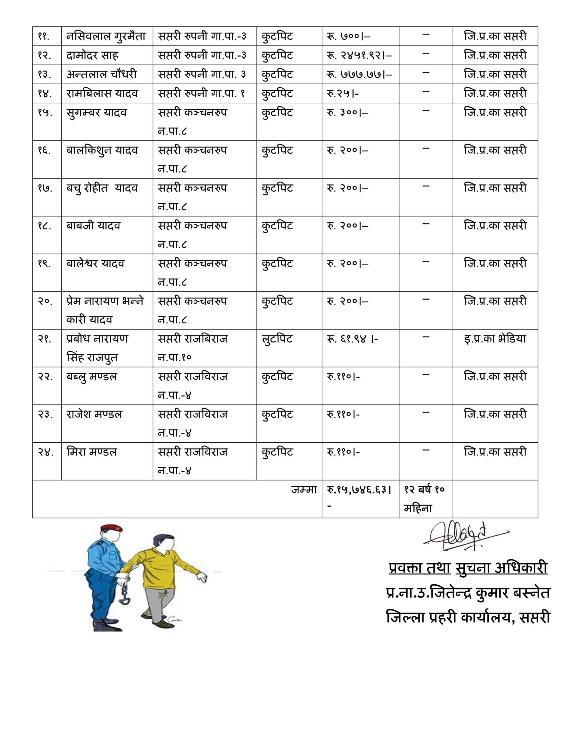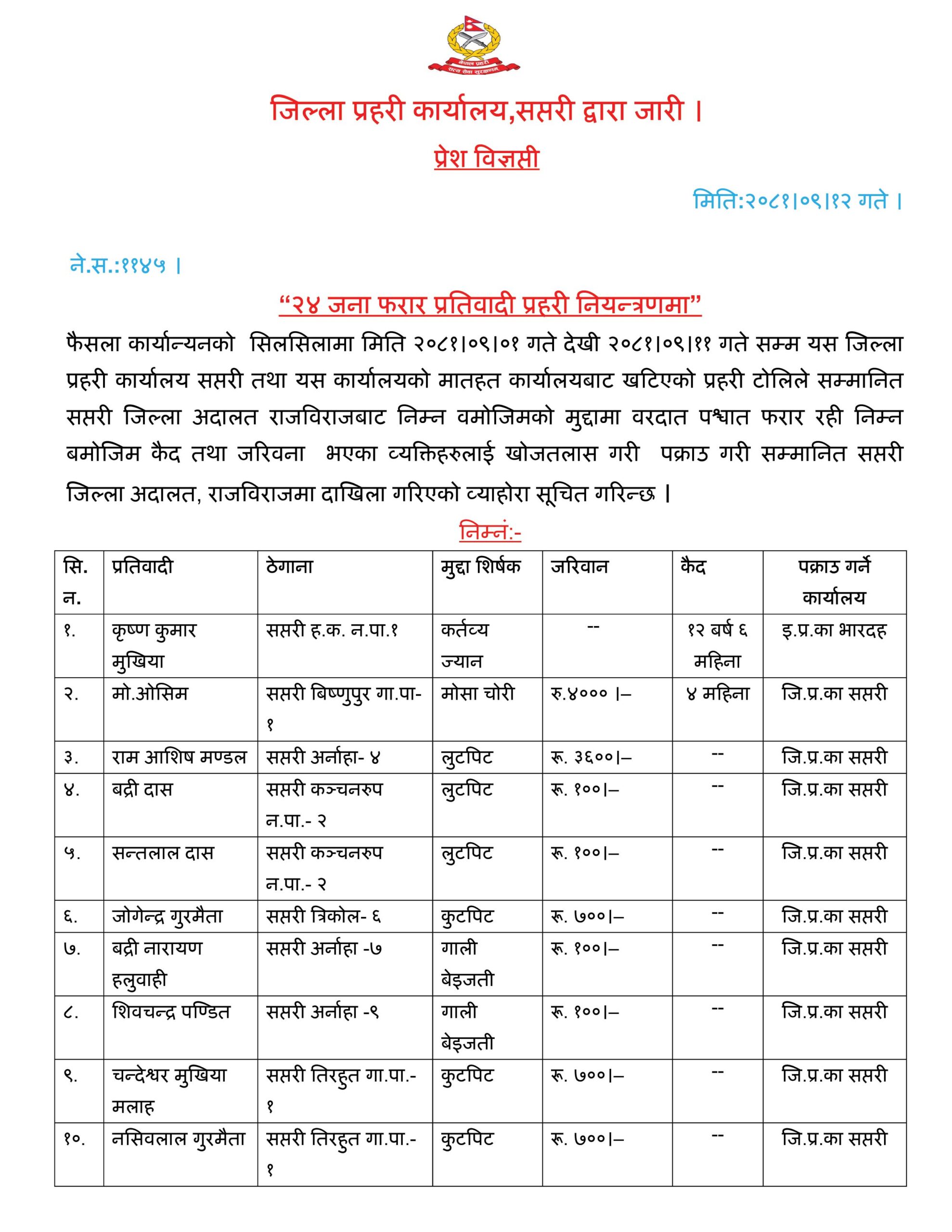 सप्तरी प्रहरीद्वारा ११ दिनमै २४ फरार प्रतिवादी पक्राउ, पक्राउ पर्ने सवैभन्दा धेरै कञ्चनरुपका