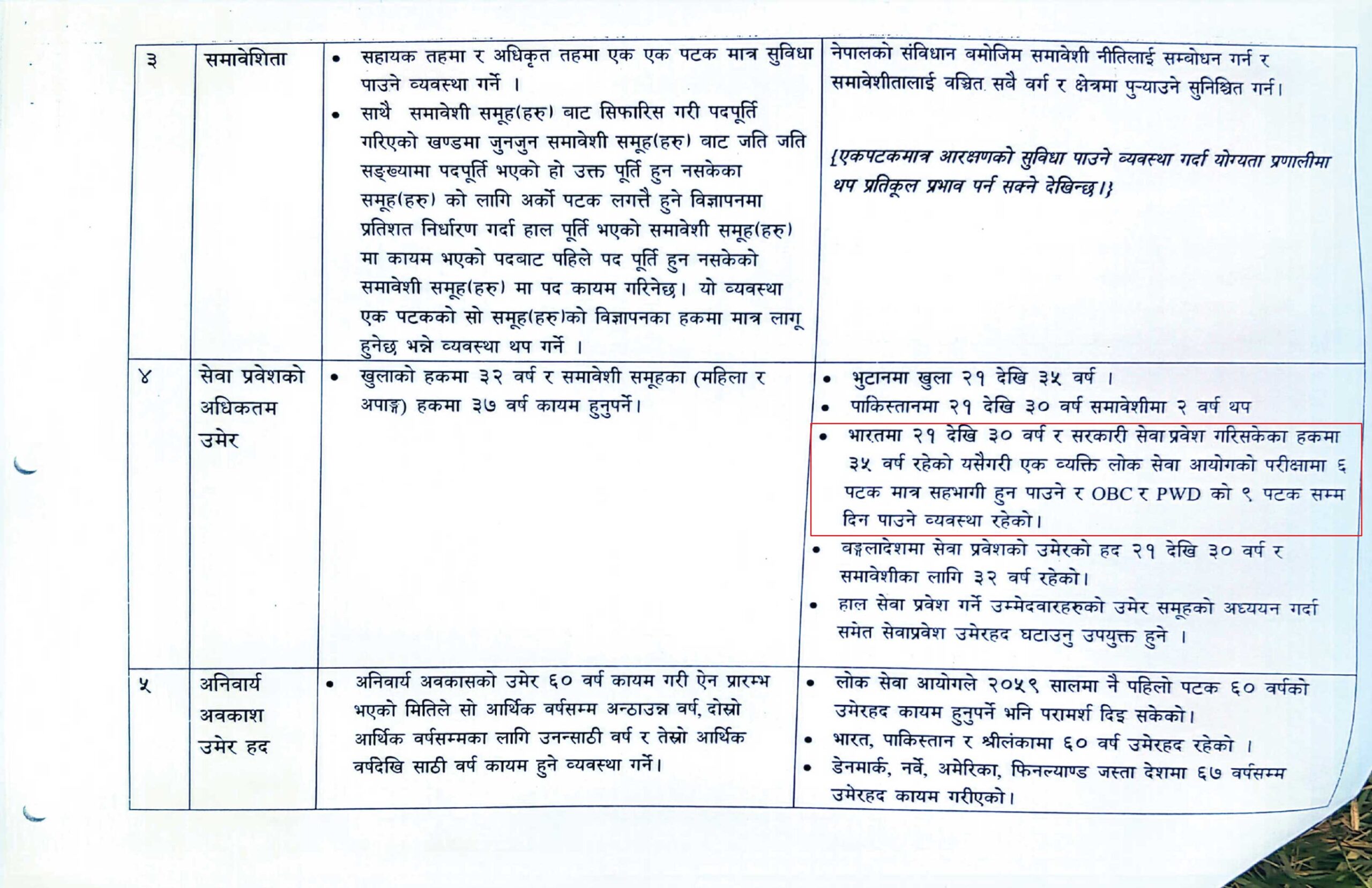 आयोगले सेवा प्रवेश पुरुषको हकमा ३२ वर्ष र समावेशीको हकमा ३७ वर्ष उपयुक्त हुने सुझाव दिएको छ। अहिले निजामति सेवा प्रवेशको उमेर हद ३५ र ४० वर्ष छ।