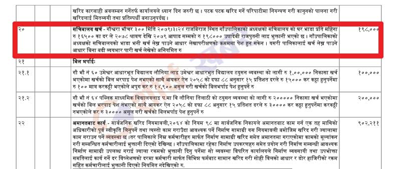 सचिवालय खर्च शीर्षकमा देखाईएको उक्त पैसा महालेखाले बेरुजु देखाएको छ। महालेखाको ०७९ (२०७८।७९०) को प्रतिवेदनमा भनिएको छ–‘गौश्वरा भौचर ३०० मिति २०७९।३।२४ राजबिराज स्थित गाँउपालिकाको अध्यक्षको सचिवालयको घर भाडा प्रति महिना रु १६५०० का दरले २०७८ श्रावण देखि २०७९ आषाढ सम्मको रु १ लाख ९८ हजार उषादेवी राजपुतनीलाइ भुक्तानी भएको छ। गाँउपालिकाको अध्यक्षको सचिवालयको भाडा भनी खर्च लेख्न पाउने आधार लेखापरीक्षणको क्रमममा पेश हुन सकेन। यसरी पालिकालाई खर्च लेख्न पाउने आधार बिना बढी व्ययभार पारी खर्च लेखेको अनियमित १९८,०००।’ उषादेवी राजपुतनी उनकी आमा हुन।