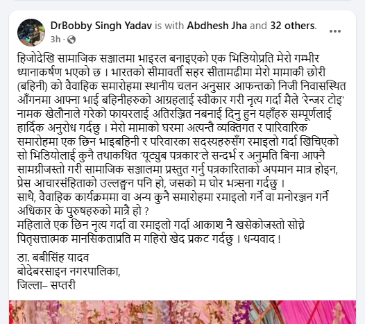 ‘मेरो मामाकी छोरी (बहिनी) को वैवाहिक समारोहमा स्थानीय चलन अनुसार आफन्तको निजी निवासस्थित आँगनमा आफ्ना भाई बहिनीहरुको आग्रहलाई स्वीकार गरी नृत्य गर्दा मैले ‘रेन्जर टोइ’ नामक खेलौनाले गरेको फायरलाई अतिरञ्जित नबनाई दिनु हुन यहाँहरु सम्पूर्णलाई हार्दिक अनुरोध गर्दछु’ उनले भनेकी छिन्–‘मेरो मामाको घरमा अत्यन्तै व्यक्तिगत र पारिवारिक समारोहमा एक छिन भाइबहिनी र परिवारका सदस्यहरुसँग रमाइलो गर्दा खिचिएको सो भिडियोलाई कुनै तथाकथित ‘यूट्युब पत्रकार’ले सन्दर्भ र अनुमति बिना आफ्नै सामग्रीजस्तो गरी सामाजिक सञ्जालमा प्रस्तुत गर्नु पत्रकारिताको अपमान मात्र होइन, प्रेस आचारसंहिताको उल्लङ्घन पनि हो, जसको म घोर भत्र्सना गर्दछु।’