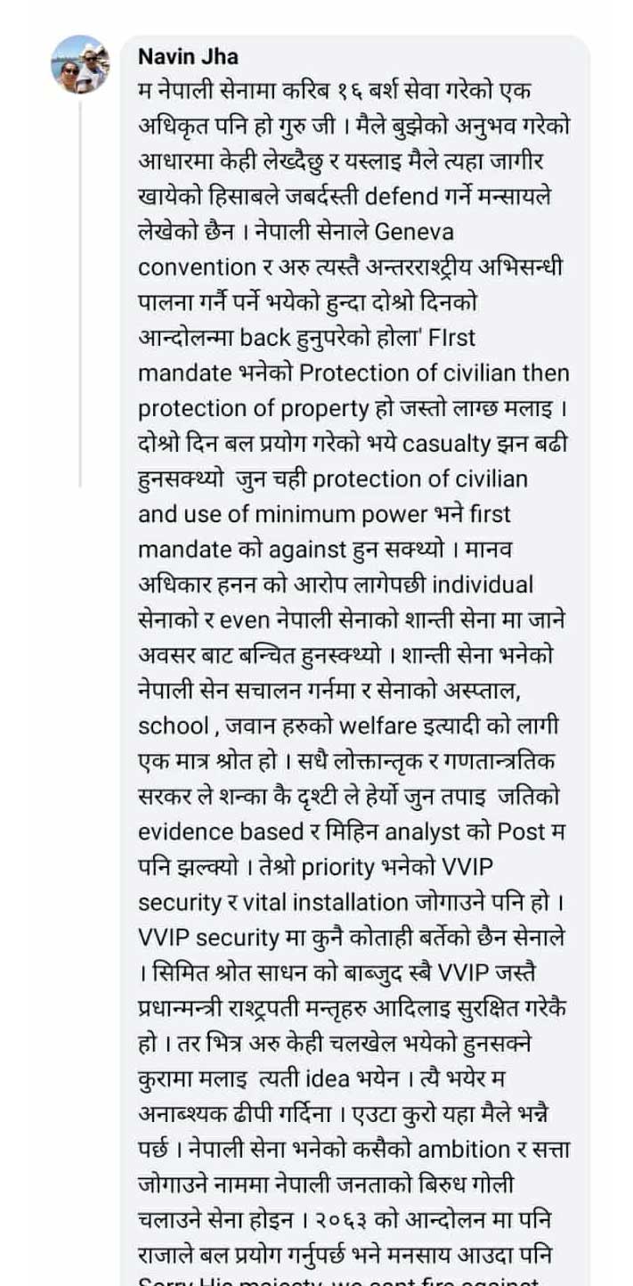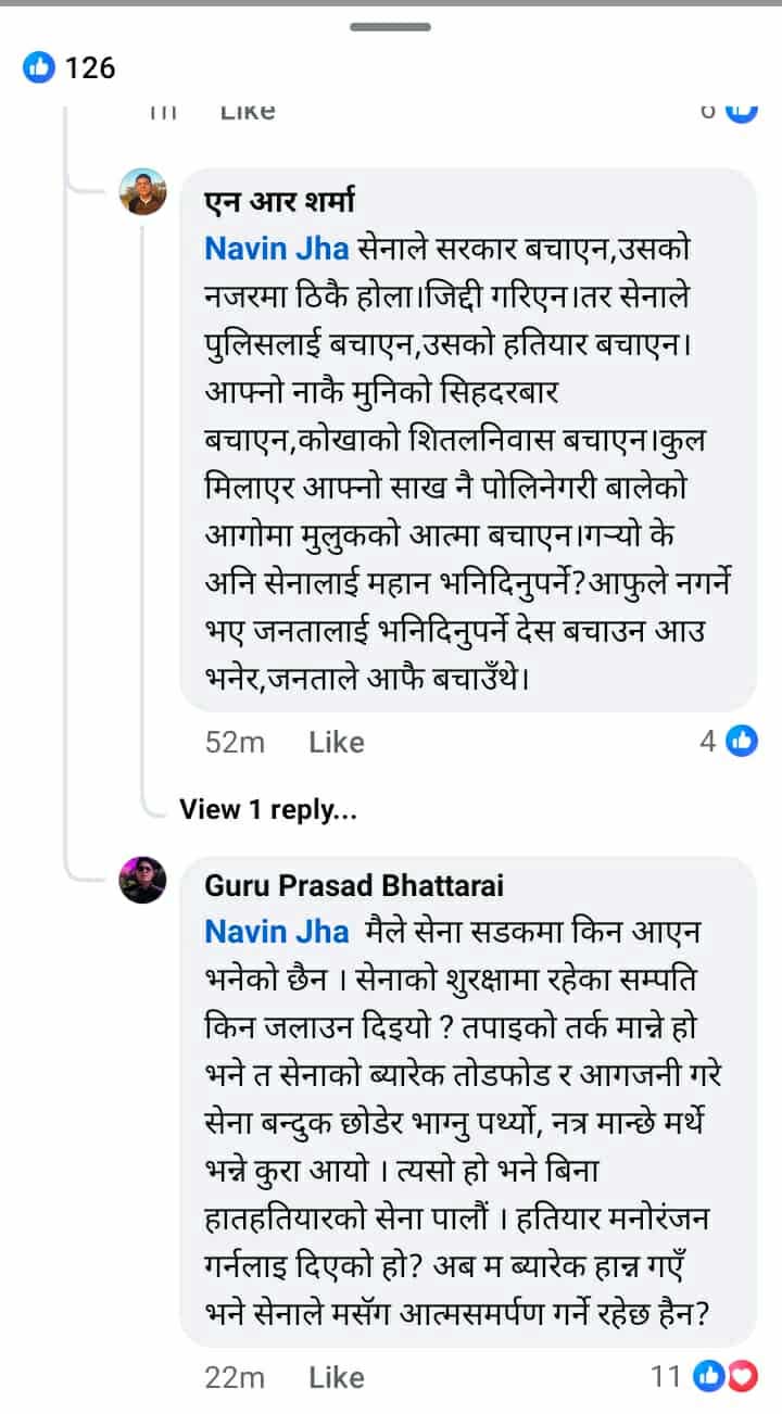 भट्टराईले देश जलिरहँदा सेनाले प्रहरी र स्थानिय सुरक्षा संरचनासमेत बचाउन नसकेको भन्दै असन्तोष जनाएका छन्। ‘म सेना सडकमा किन आएन भनेर भन्दिन, तर सेनाको सुरक्षामा रहेका सम्पत्ति किन जलाउन दिइयो?’ भन्दै उनले प्रश्न उठाएका छन्।