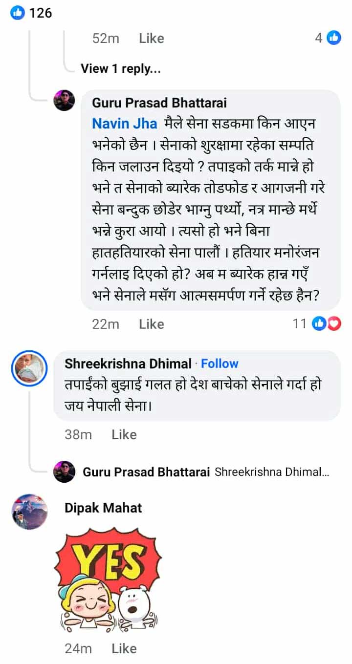 भट्टराईले सेनाको निष्क्रियतालाई ऐतिहासिक दृष्टान्तसहित तुलना गर्दै भने, ‘अबदेखि बिना हातहतियारको सेना पालौं, हतियार मनोरञ्जनका लागि दिएको हो? म ब्यारेक हान्न गएँ भने सेनाले मसँग आत्मसमर्पण गर्ने रहेछ हैन?’