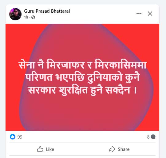 एमालेका युवा नेता भट्टराईको टिप्पणीः सेना मीर जाफरमा परिणत भएपछि दुनियाँको कुनै सरकार सुरक्षित हुँदैन