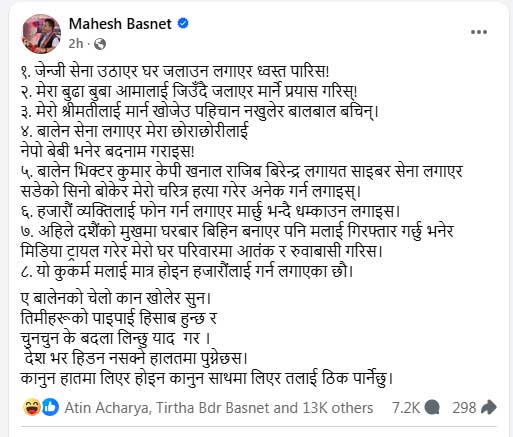 काठमाडौँ— नेकपा एमालेका पोलिटब्युरो सदस्य महेश बस्नेतले काठमाडौँ महानगरपालिका मेयर बालेन्द्र साह र उनको नजिकका समूहलाई ठिक पार्ने चेतावनी दिएका छन्। जेनजी आन्दोलनपछि बनेको अन्तरिम सरकार र त्यसका केही पात्रप्रति चर्को असन्तुष्टि जाहेर गर्दै बस्नेतले सामाजिक सञ्जालमा आफ्ना व्यक्तिगत र पारिवारिक पीडा सार्वजनिक गरेका छन।