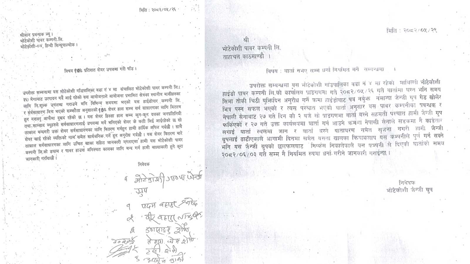 त्यही क्रममा कम्पनीका प्रतिनिधिलाई जबर्जस्ती १० प्रतिशत निःशुल्क सेयर दिने सम्झौतामा हस्ताक्षर गर्न बाध्य पारिएको कम्पनीको दाबी छ। तर कम्पनीको संचालक समितिले उक्त सम्झौता पारित नगरेसम्म कार्यान्वयन नहुने व्यवस्था भएकाले सम्झौता वैधानिक रूपमा लागू भएको छैन।