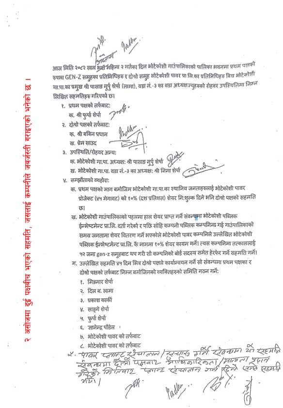 गाउँपालिका अध्यक्ष पासाङनुर्पु शेर्पा र वडा अध्यक्ष निमा शेर्पाको रोहवरमा सम्झौता गरिएको भनिए पनि, कम्पनीले यो ‘जबर्जस्ती गरिएको कागज’ भएको दाबी गरेको छ। अपर भोटेकोशी जलविद्युत् आयोजना सन् १९९६ मा अमेरिकाको पान्डा इनर्जी कम्पनीको लगानीमा सुरु भएको थियो र सन् २००१ देखि विद्युत् उत्पादन गरिरहेको छ।