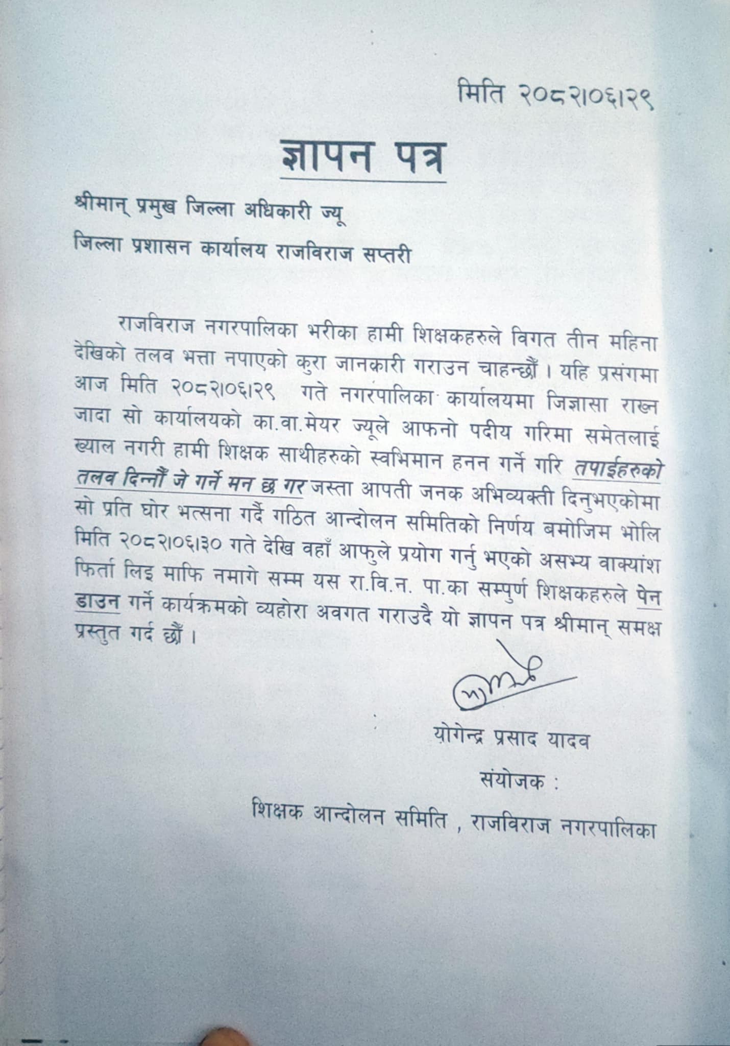 ‘तलव दिन्नँ, जे गर्ने हो गर’ भन्दै कार्यवाहक मेयरको धम्कीपछि राजविराजका शिक्षक आन्दोलित, तीन महिनादेखि तलवविहिन