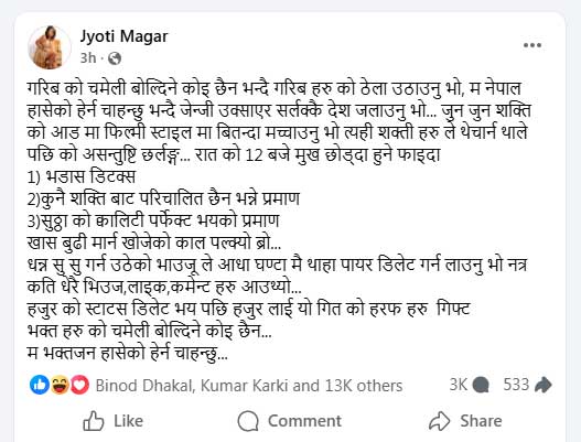 अब बालेनमाथि आक्रोश राजनीतिक नेतासँगै कलाकारहरूबाट पनि आइरहेको छ। गायिका ज्योति मगरले फेसबुकमार्फत बालेनमाथि कडा व्यङ्ग्य गरेकी छन्। उनले लेखेकी छन्, ‘गरिबको चमेली बोल्दिने कोइ छैन भन्दै गरिबहरुको ठेला उठाउनुभो, म नेपाल हासेको हेर्न चाहन्छु भन्दै जेन्जी उक्साएर सर्लक्कै देश जलाउनु भो…। जुन जुन शक्तिको आडमा फिल्मी स्टाइलमा बितन्डा मच्चाउनु भो त्यही शक्तीहरु ले थेचार्न थालेपछिको असन्तुष्टि छर्लङ्ग…।
