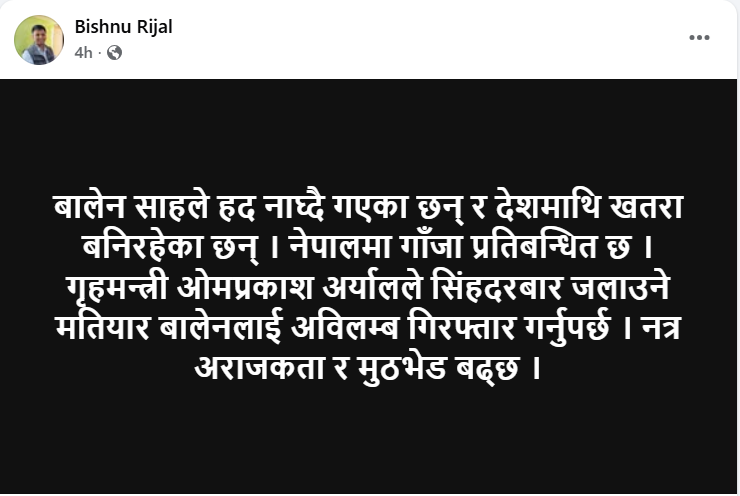 एमालेका पोलिटब्युरो सदस्य सूर्य थापाले त झनै कडा आरोप लगाउँदै बालेनलाई ‘गाँजाको अम्मली’ नै भनेका छन्। राजनीतिक पक्षबाट एमाले नेता विष्णु रिजालले बालेनलाई ‘देशमाथि खतरा’ भन्दै तत्काल पक्राउ गर्न माग गरेका छन्। उनले लेखेका छन्, ‘बालेन साहले हद नाघ्दै गएका छन् र देशमाथि खतरा बनेका छन्। नेपालमा गाँजा प्रतिबन्धित छ। गृहमन्त्री ओमप्रकाश अर्यालले सिंहदरबार जलाउने मतियार बालेनलाई अविलम्ब गिरफ्तार गर्नुपर्छ, नत्र अराजकता र मुठभेड बढ्छ।’