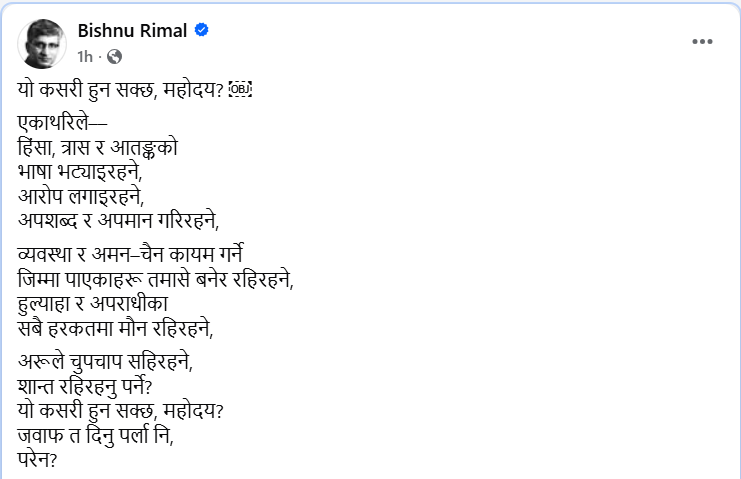 कसैले त लेखेका छन्, ‘राजनीतिक दलहरूले देशलाई अश्लील बनाएका छन्, बालेनको शब्द मात्र त्यसको प्रतिबिम्ब हो।’ बालेन साह बारम्बार फेसबुक स्टाटसका कारण विवादमा पर्ने नेताका रूपमा परिचित छन्। यसअघि पनि उनले प्रधानमन्त्रीदेखि सांसदसम्ममाथि व्यङ्ग्यात्मक शैलीमा आक्रमण गरेका थिए। तर यस पटकको विवाद केवल राजनीतिक नभई शिष्टाचार र सार्वजनिक आचरणसँग जोडिएको छ।