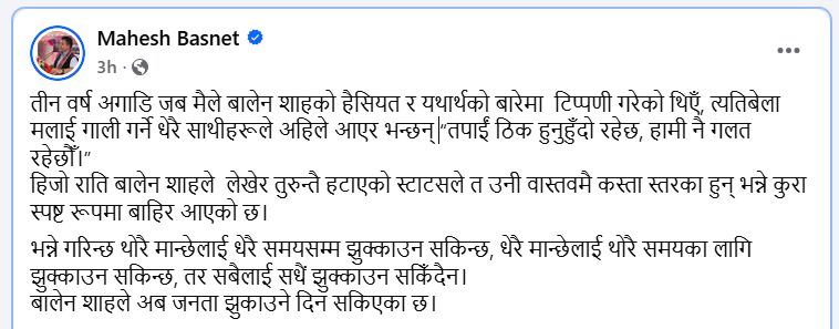 स्टाटस सार्वजनिक भएको केही मिनेटमै आलोचनाको बाढी आएपछि उनले त्यसलाई हटाए पनि ढिलो भइसकेको थियो। त्यसको स्क्रिनसट सामाजिक सञ्जालमा भाइरल भयो र त्यसपछि सुरु भयो ‘बालेनविरुद्धको राजनीतिक आक्रोश’।