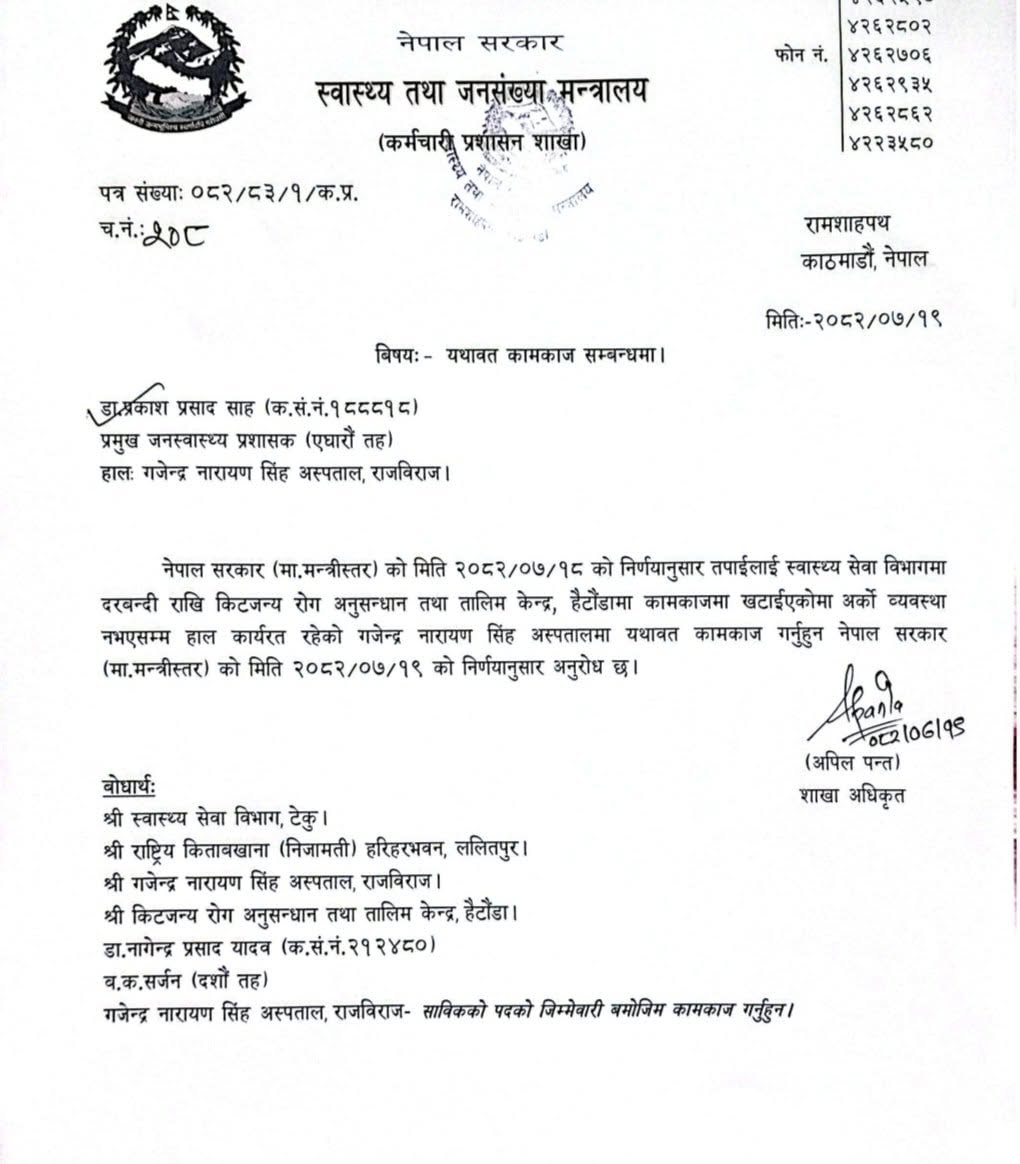 डा. साह २०८१ चैत ७ गते मेसुका रूपमा अस्पतालमा हाजिर भएका थिए। त्यसपछि २०८२ कार्तिक १८ गते मन्त्रालयमा भएको मन्त्रीस्तरीय बैठकले उनको स्थानान्तरणको निर्णसहित कार्तिक १९ गते डा. नागेन्द्र यादवलाई निम्मित मेसु तोक्ने निर्णय ग¥यो। तर कार्तिक २० गते, जेन–जी समूहको ज्ञापनपछि, त्यो निर्णय फिर्ता भयो र साह पुनः पदमा बहाल भए।
