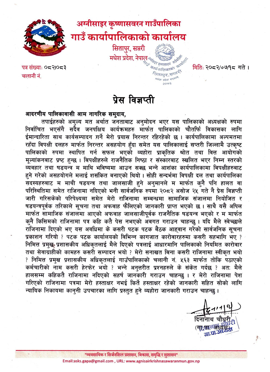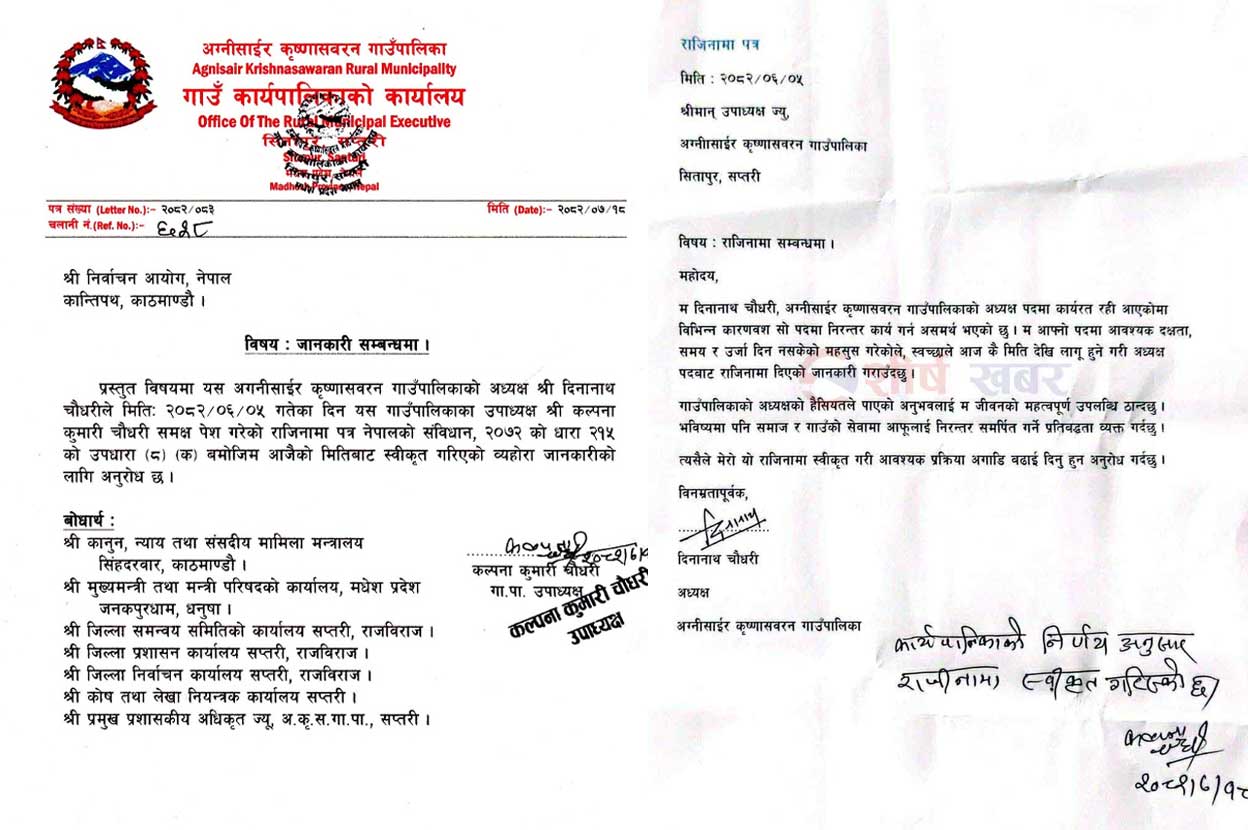 त्यसपछि पालिका अध्यक्ष चौधरीको राजीनामा विवाद अहिले केन्द्रबिन्दुमा छ। मंगलबार साँझ अध्यक्ष चौधरीले पदबाट राजीनामा दिएको भन्दै सामाजिक सञ्जालमा पत्र सार्वजनिक भएको थियो। पत्रमा असोज ५ को मिति उल्लेख गरिएको छ र कात्तिक १८ मा कार्यपालिका बैठकबाट स्वीकृत भएको देखिन्छ। उपाध्यक्ष कल्पना चौधरी र वडा नम्बर १ का वडाध्यक्ष सबजुल खलिफाले अध्यक्षले राजीनामा दिएको पुष्टि गरेका छन्।
