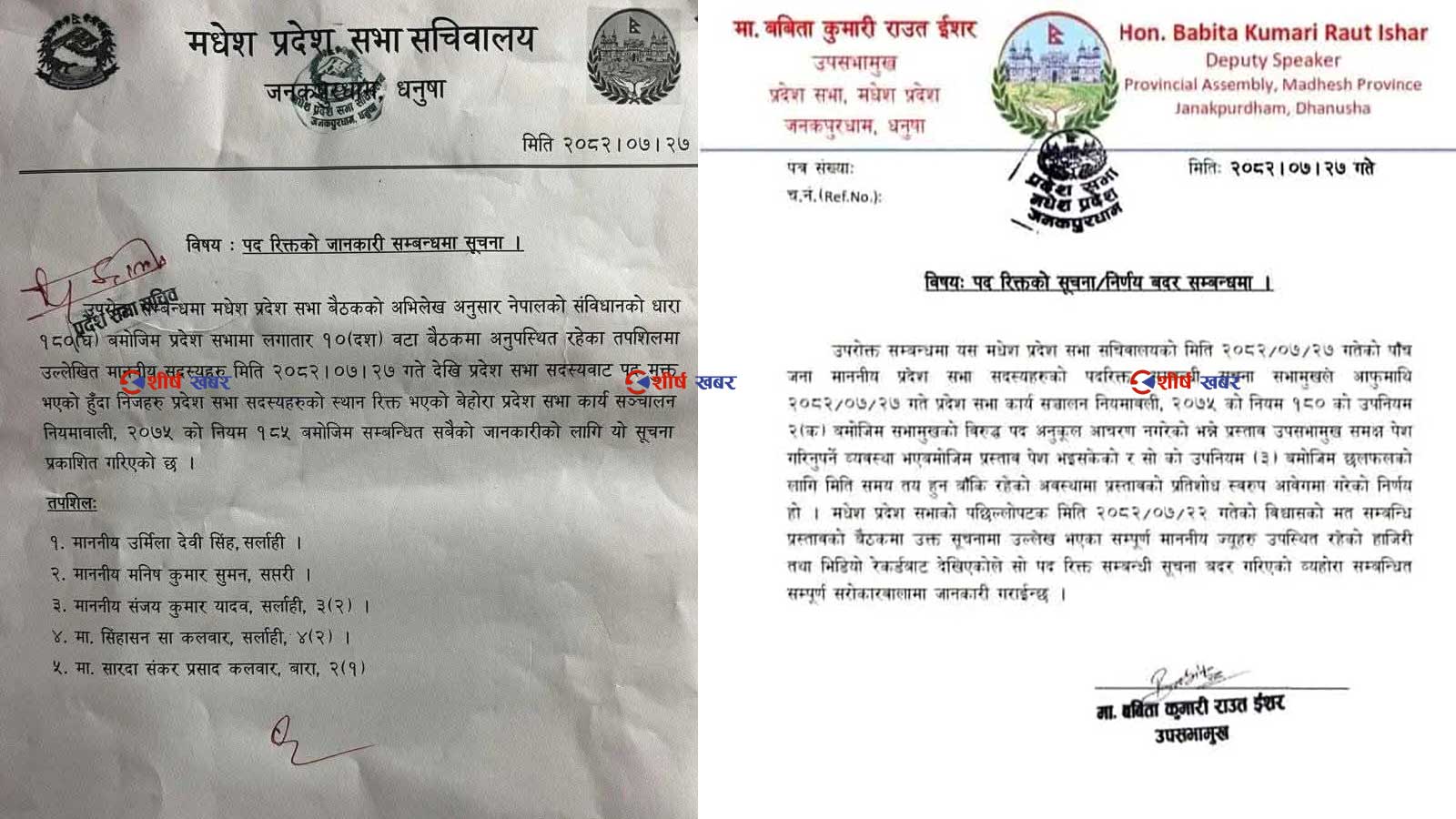 सभामुख मण्डलले लगातार १० पटक प्रदेशसभा बैठकमा अनुपस्थित भएको आरोप लगाउँदै पाँच जना सांसदहरु उर्मिला देवीसिंह, मनिषकुमार सुमन, सञ्जयकुमार यादव, सिंहासन सा कलवार र शारदाशंकर प्रसाद कलवारलाई पदमुक्त गर्ने सूचना जारी गरे।
