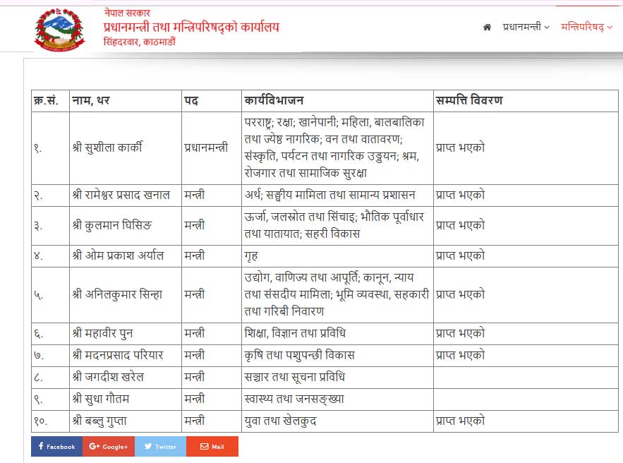 हाल प्रधानमन्त्री सुशीला कार्की नेतृत्वको १० सदस्यीय मन्त्रिपरिषद् छ। प्रधानमन्त्री तथा मन्त्रिपरिषद् कार्यालयको वेबसाइट अनुसार अधिकांश मन्त्रीले आफ्नो सम्पत्ति विवरण बुझाएका छन्। सञ्चारमन्त्री जगदीश खरेल र स्वास्थ्य मन्त्री सुधा गौतमको विवरण प्राप्त भएको छैन। विवरण बुझाइसकेका मन्त्रीहरूको पनि सम्पत्ति विवरण सार्वजनिक नगरी गोप्य राखिएको छ।