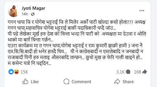 ‘गगन थापाजी र योगेश भट्टराई जीले मिलेर अर्को पार्टी खोल्दा कसो होला? अध्यक्ष गगन थापा, महासचिव योगेश भट्टराई, बाकी पदाधिकारी थप्दै जाऔं।’ उनले लेखेकी छिन्,–‘यी पढे–लेखेका मूर्खहरू देशको चिन्ता भन्दा पनि पार्टीको अध्यक्षतामा देउवा र ओलीको वढ्ता चिन्ता गर्छन्। एउटा कार्यक्रममा त गगन थापा, योगेश भट्टराई र रामकुमारी झाक्री हामी तीन जना नै एमसीसीवादी हो भनेर हास्दै थिए।’