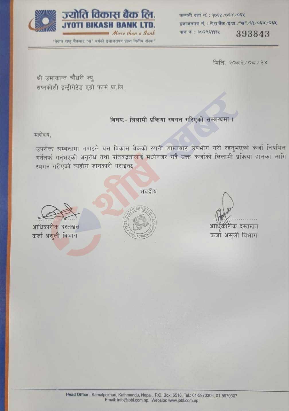 बैंकका अनुसार सप्तकोशी इन्ट्रिग्रेटेड एग्रो फार्म प्रालिले २०७८ वैशाख २३ गते ४ करोड ५० लाख रुपैयाँ ऋण लिएको थियो। ओद्राहस्थित ३ बिघा १४ कठ्ठा र कञ्चनरूप नगरपालिका–१२ मा रहेको १६ कठ्ठा ८ धुर जग्गा धितो राखिएको थियो। २०८१ चैत २८ पछि किस्ता नतिरेपछि बैंकले धितो लिलामीको सूचना निकालेको थियो। त्यो सूचनालाई फेसवुक, टिकटक लगायतका सामाजिक सञ्जालमा पनि शेयर गरेपछि सेयरधनीहरू आक्रोशित बनेका थिए।