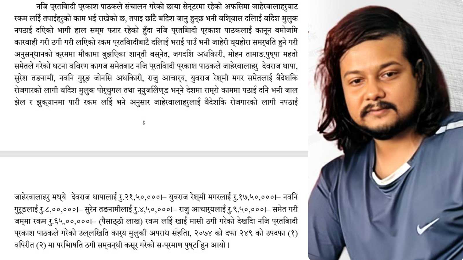 उनीविरुद्ध सुरेश ताङनी, देवराज थापा, नबीन गुरुङ, जेनिश अधिकारी, राजु आचार्य र युवराज रेश्मी मगरले जाहेरी दिएका थिए । वैदेशिक रोजगारीका लागि न्युजिल्याण्ड पठाउने भन्दै उनीहरूबाट पाठकले ६५ लाख उठाएर फरार भएको देखिएको छ।
