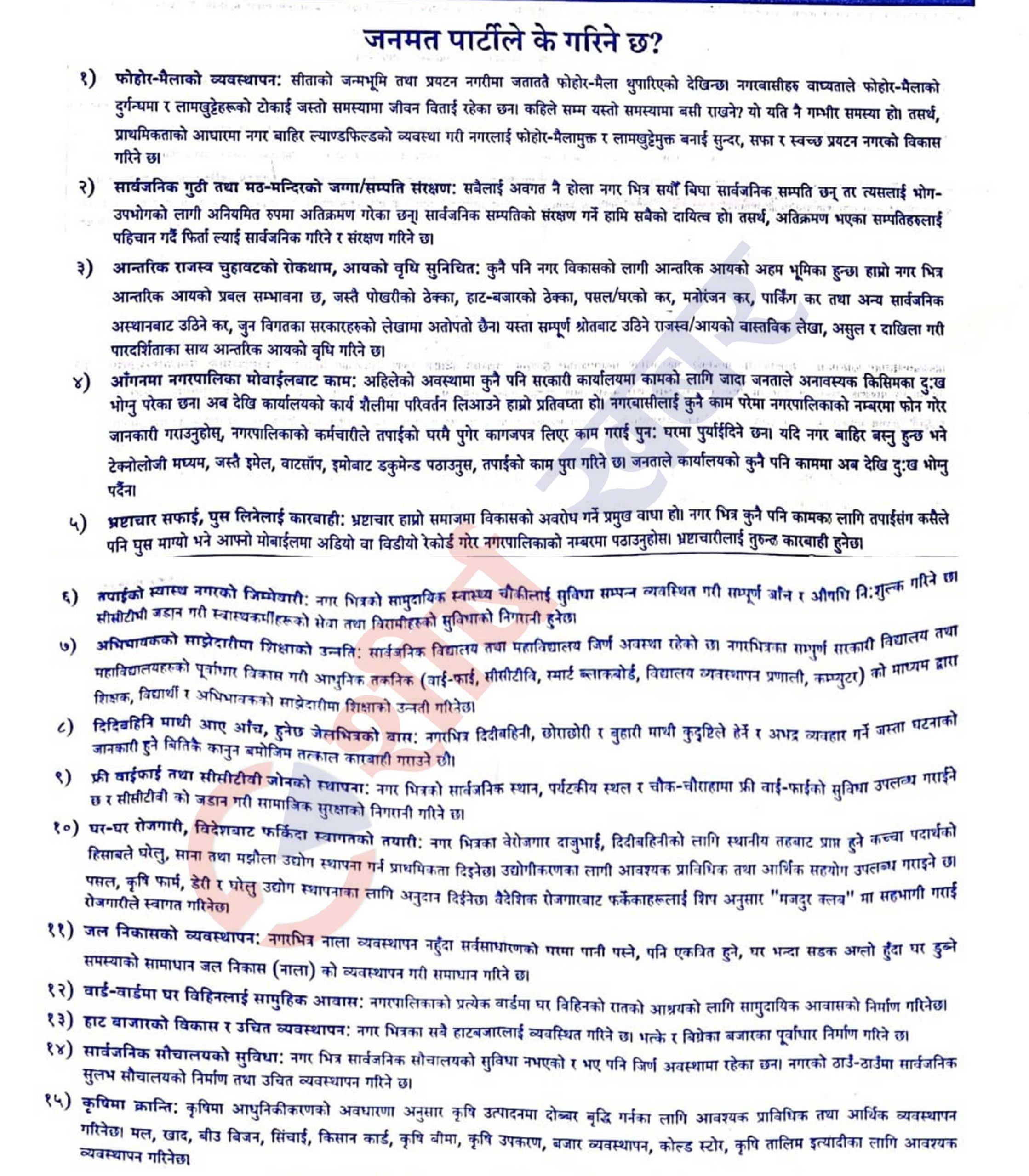 फ्री वाई–फाई र सीसीटीभी जोन, घर–घर रोजगारी, वैदेशिक रोजगारबाट फर्केकालाई सम्मानसहित रोजगारी, नाला व्यवस्थापन, घरविहीनका लागि सामुदायिक आवास, हाटबजारको सुधार, सार्वजनिक शौचालय र कृषिमा क्रान्ति—यी सबै बुँदा घोषणापत्रमा चम्किला अक्षरमा छन्, तर जनताको दैनिक जीवनमा तिनको झल्को भेटिँदैन।