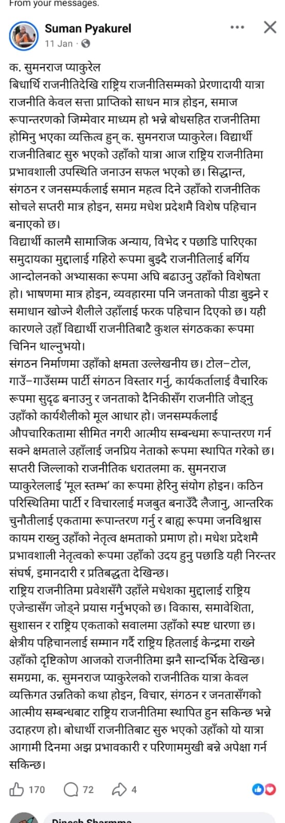 प्याकुरेलले २७ पुसमा फेसबुकमा लामो स्ट्याटस लेख्दै आफ्नै प्रचार आफैंले गरेका छन्। प्रचार मात्र होइन, आफैंलाई आफैंले नेता घोषणा गर्ने आत्म–प्रचारको दस्तावेज नै सार्वजनिक गरेका छन्। स्ट्याटस पढ्दा लाग्छ—यो कसैको मूल्याङ्कन, विश्लेषण वा तटस्थ टिप्पणी होइन, बरु इतिहास, जनमत र आलोचनालाई छलेर तयार पारिएको स्वघोषित महानताको कथा हो।