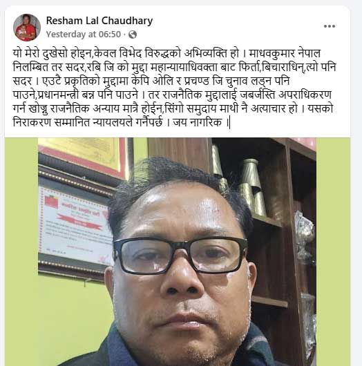 उनको स्ट्याटस भावनाले भरिएको छ—रोएको, पीडित बनेको, मधेशलाई उपनिवेश भन्दै आक्रोश पोखेको। तर, यो कानुनी विषयलाई जातीय र भावनात्मक रंग दिएर मतदाता बहकाउने प्रयासबाहेक केही होइन। सर्वोच्च अदालतले अन्तरिम आदेश दिन अस्वीकार गरेको, कारण देखाउ आदेश जारी गरेको तथ्यलाई छायामा पारेर राउतले ‘सिंगो समुदायमाथिको अत्याचार’को कथा बेच्न खोजेका छन्।