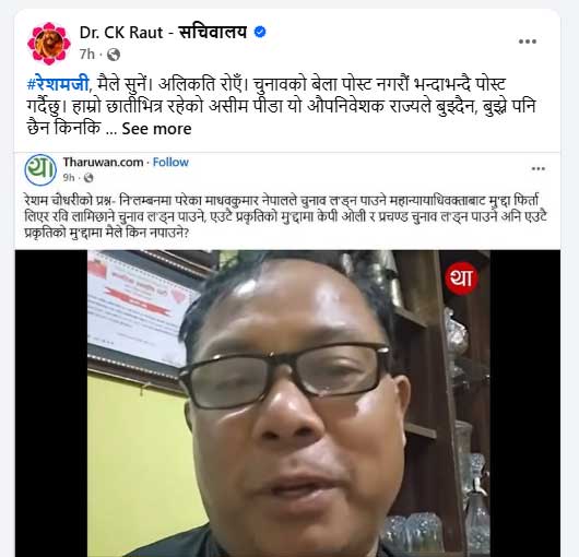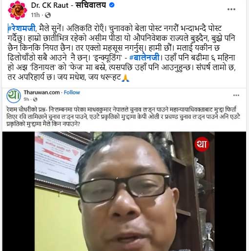 त्यसको प्रमाण उनको फेसबुक गतिविधिमा देखिन्छ। ‘Dr. CK Raut – सचिवालय’ नामको पेजबाट, जुन उनी आफैँ चलाउने गर्छन्, उनले नागरिक उन्मुक्ति पार्टीका संरक्षक रेशमलाल चौधरीको प्रसंग जोडेर ‘औपनिवेशक राज्य’जस्तो भारी शब्द प्रयोग गरे। टीकापुर हत्याकाण्डसँग सम्बन्धित कर्तव्य ज्यान मुद्दामा तीन तहका अदालतबाट दोषी ठहर भइसकेका चौधरीको उम्मेदवारी निर्वाचन आयोगले खारेज गरेको विषयलाई लिएर राउतले आँसुको राजनीति सुरु गरे।