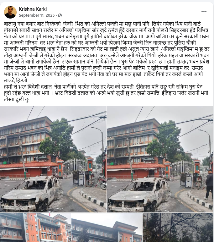 अझ गम्भीर कुरा त के छ भने, उनले भदौ २५ गते फेसबुकमा लेख्दै संसद् भवनभित्र कुर्सी जलाएको र नेताहरूको घरसम्म पुगेर आगजनी गरेको स्वीकार नै गरेका छन्। उनले लेखेका छन— ‘हामी संसद् भवन प्रवेश गर्यौं, भित्र अगाडि पुरानो कुर्सी जम्मा गरेर आगो बाल्यौं र खुसीयाली मनायौं… नेताको घर मात्र हाम्रो टार्गेट थियो।’