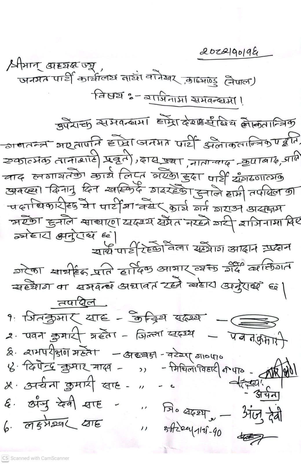 पछिल्लो पटक पार्टीका केन्द्रीय सदस्य जितकुमार साहसहित सात जना नेताले एकैसाथ राजीनामा दिएपछि पार्टीभित्रको असन्तोष थप औपचारिक रूपमा सतहमा आएको छ। राजीनामा दिनेहरूमा धनुषा जिल्ला सदस्य पवनकुमारी महतो, बटेश्वर गाउँपालिका अध्यक्ष रामपरीक्षण महतो, मिथिला बिहारी नगरपालिका अध्यक्ष दिपेन्द्र कुमार यादव, अञ्जु देवी साहलगायत प्रभावशाली नामहरू समावेश छन्।