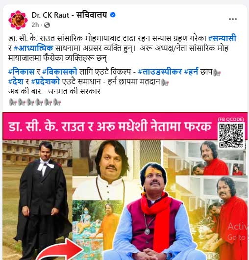 वास्तवमा राउतले विगत वर्षौंदेखि नै आफूलाई सन्यासी, त्यागी, संयमी र सिद्धान्तवादी नेता भनेर चित्रण गर्दै आएका छन्। तर विडम्बना के छ भने यही ‘सन्यासी’ छवि बोकेका व्यक्ति आज चुनावी र प्रचारात्मक गतिविधिमा सबैभन्दा सक्रिय देखिन्छन्। घरदैलो, सभा, जुलुस, भाषण, पोस्टर र डिजिटल प्रचार—सबै माध्यममा उनी अरू दलको तुलनामा कम छैनन्। कतिपय ठाउँमा उनी आफूलाई एकमात्र विकल्प भनेर अरू सबै नेता भ्रष्ट, लोभी र असफल भएको दाबी गर्दै आएका छन्।