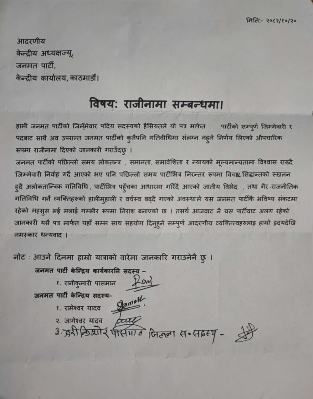 पछिल्लो घटनाक्रममै सिरहाबाट केन्द्रीय कार्यकारिणी सदस्य रानीकुमारी पासवान, केन्द्रीय सदस्यहरू रामेश्वर यादव, जागेश्वर यादव र जिल्ला समिति सदस्य हरिकिशोर पासवानले सामूहिक रूपमा पार्टी परित्याग गरे। मंगलबार लिखित राजीनामा दिएका उनीहरू सबै मिर्चैयाका बासिन्दा हुन्। अध्यक्ष राउतलाई बुझाएको पत्रमा उनीहरूले पार्टीले विचार, सिद्धान्त र मूल उद्देश्य गुमाएको, जातिवाद हाबी भएको र गैरराजनीतिक व्यक्तिहरूको हालीमुहाली बढेको आरोप लगाएका छन्। जनमत पार्टीभित्र ‘व्यक्तिगत स्वार्थ र गुटबन्दी’ हावी भएको उनीहरूको ठहर छ।