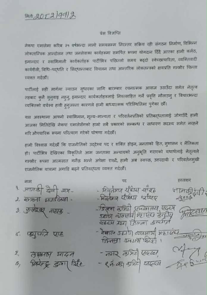 उनीहरूले करिब ३५ वर्षसम्म संगठन निर्माण, लोकतान्त्रिक आन्दोलन र जनसेवामा योगदान दिँदै आएका भए पनि नेतृत्वबाट सुधारका पहललाई बेवास्ता गरिएपछि पार्टी परित्याग गर्न बाध्य भएको उल्लेख गरेका छन्।