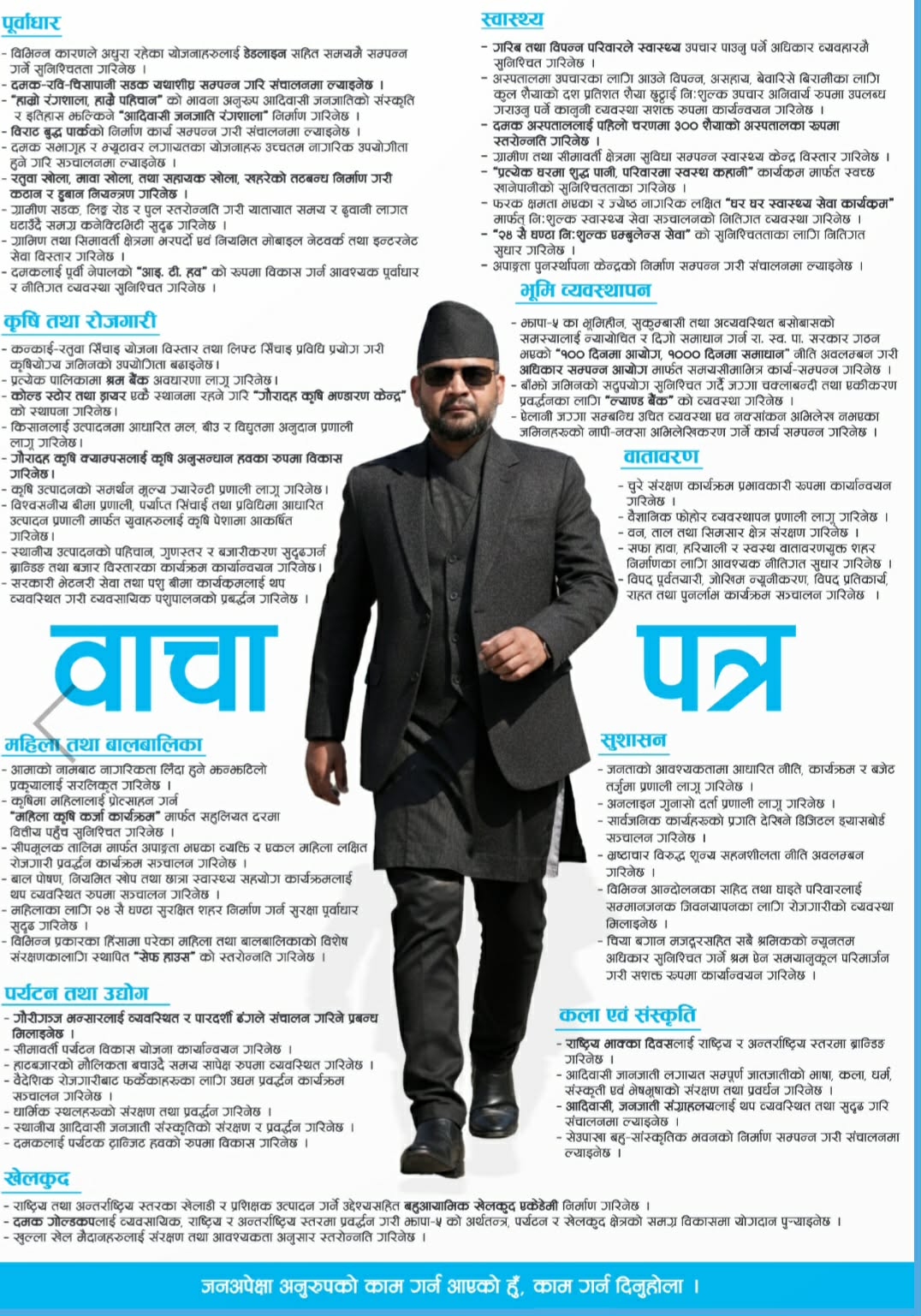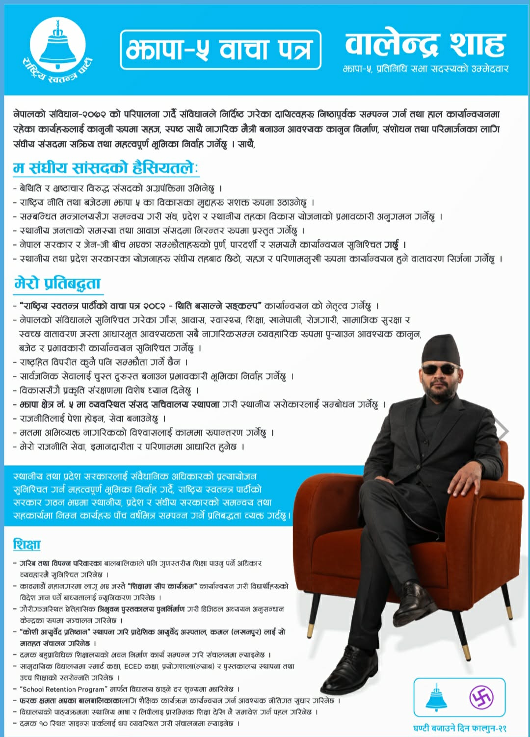 काठमाडौँ— राष्ट्रिय स्वतन्त्र पार्टी (रास्वपा)का वरिष्ठ नेता बालेन्द्र साह ‘बालेन’ले झापा क्षेत्र नम्बर–५ केन्द्रित आफ्नो चुनावी बाचापत्र सार्वजनिक गरेका छन्। झापा–५ बाट प्रतिनिधिसभा सदस्यका उम्मेदवार रहेका उनले सार्वजनिक गरेको बाचापत्रमा संघीय संसद्को भूमिकादेखि स्थानीय स्तरको विकास, भूमि व्यवस्थापन, शिक्षा, स्वास्थ्य, रोजगारी र सुशासनसम्मका एजेन्डाहरूलाई समेट्दै आफूले चुनाव जितेपछि कार्यान्वयन गर्ने ठोस योजना प्रस्तुत गरेका छन्।