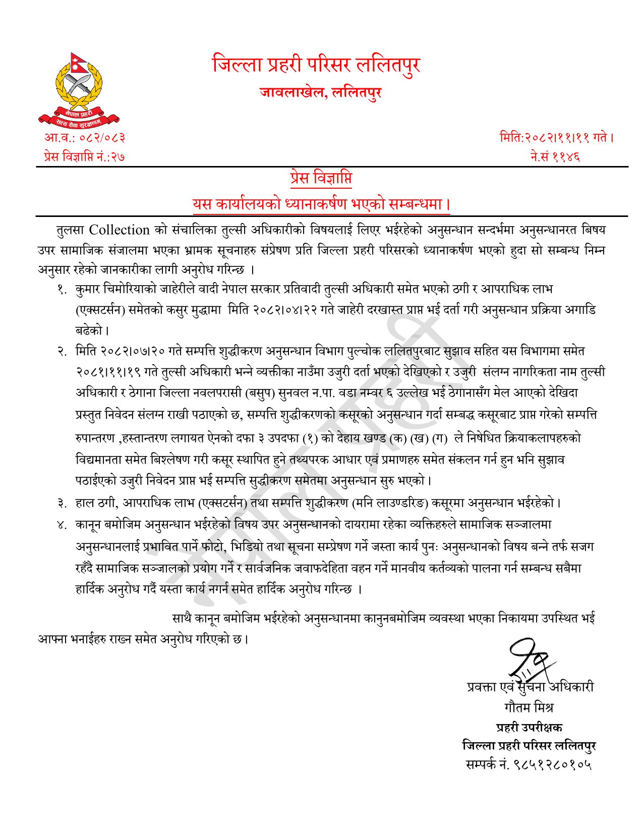 प्रहरी विवरणअनुसार, साउन २२ गते कुमार चिमोरियाले दिएको जाहेरीका आधारमा नेपाल सरकार वादी र तुल्सी अधिकारीसहित प्रतिवादी रहने गरी ठगी तथा आपराधिक लाभसम्बन्धी मुद्दा दर्ता गरिएको थियो। सोही जाहेरीपछि उक्त घटनाको अनुसन्धान प्रक्रिया सुरु भएको र अहिले पनि निरन्तर जारी रहेको जिल्ला प्रहरी परिसर ललितपुरले जनाएको छ।