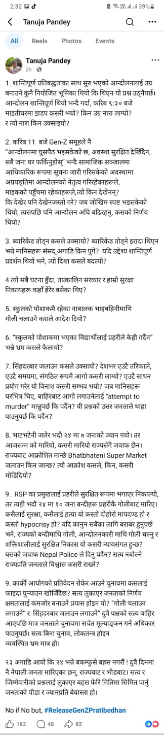 अर्कोतर्फ, गौरीबहादुर कार्की नेतृत्वको जाँचबुझ आयोगको प्रतिवेदन रोकेर राख्नुले पनि खापुङको भनाईलाई पुष्टि गर्छ भने रराज्यको नियतमाथि प्रश्न गर्ने ठाउँ दिएको छ। जेनजी आन्दोलनमा भूमिका निर्वाह गरेकी तनुजा पाण्डेले यस विषयमा मुख खोलेकी छिन्। ‘कार्की आयोगको प्रतिवेदन रोकेर आउने चुनावमा कसलाई फाइदा पु¥याउन खोजिँदैछ? सत्य लुकाएर जनताको निर्णय क्षमतालाई कमजोर बनाउने प्रयास होइन यो? ‘गोली चलाउन लगाउने र सिंहदरबार जलाउन लगाउने’ दुवै पक्षको सत्य बाहिर आएपछि मात्र जनताले चुनावमा सचेत मूल्याङ्कन गर्ने अधिकार पाउनुपर्छ। सत्य बिना चुनाव, लोकतन्त्र होइन’ भन्दै उनले असन्तुष्टि जनाएकी छिन्।