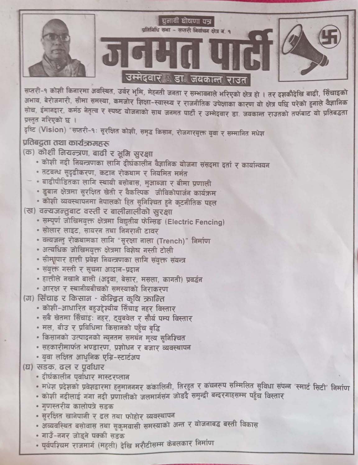 राजविराज— प्रतिनिधिसभा निर्वाचन नजिकिँदै जाँदा सप्तरी–१ मा चुनावी प्रतिस्पर्धा तातिएको छ। यसैबीच जनमत पार्टीका उम्मेदवार तथा राष्ट्रिय योजना आयोगका पूर्वसदस्य जयकान्त राउतले सार्वजनिक गरेको चुनावी घोषणापत्र अहिले राजनीतिक बहसको केन्द्रमा परेको छ।
