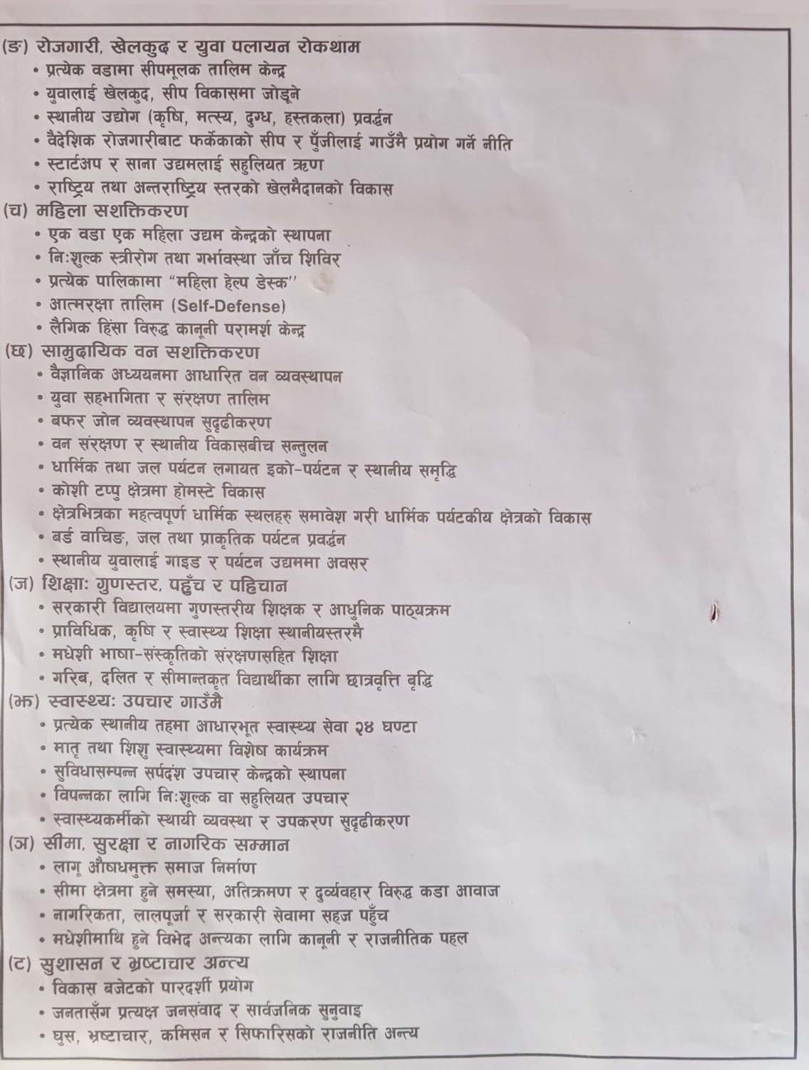 घोषणापत्रमा कोशी नियन्त्रणदेखि स्मार्ट सिटी, केबलकार, अन्तर्राष्ट्रिय खेलमैदान, कृषि क्रान्ति र रोजगारी सृजनासम्मका आकर्षक योजना समेटिएका छन्। तर यिनै योजनाले प्रश्न पनि जन्माएका छन—के यो यथार्थपरक योजना हो, कि मतदातालाई प्रभावित पार्ने ‘हावादारी घोषणापत्र’ ?