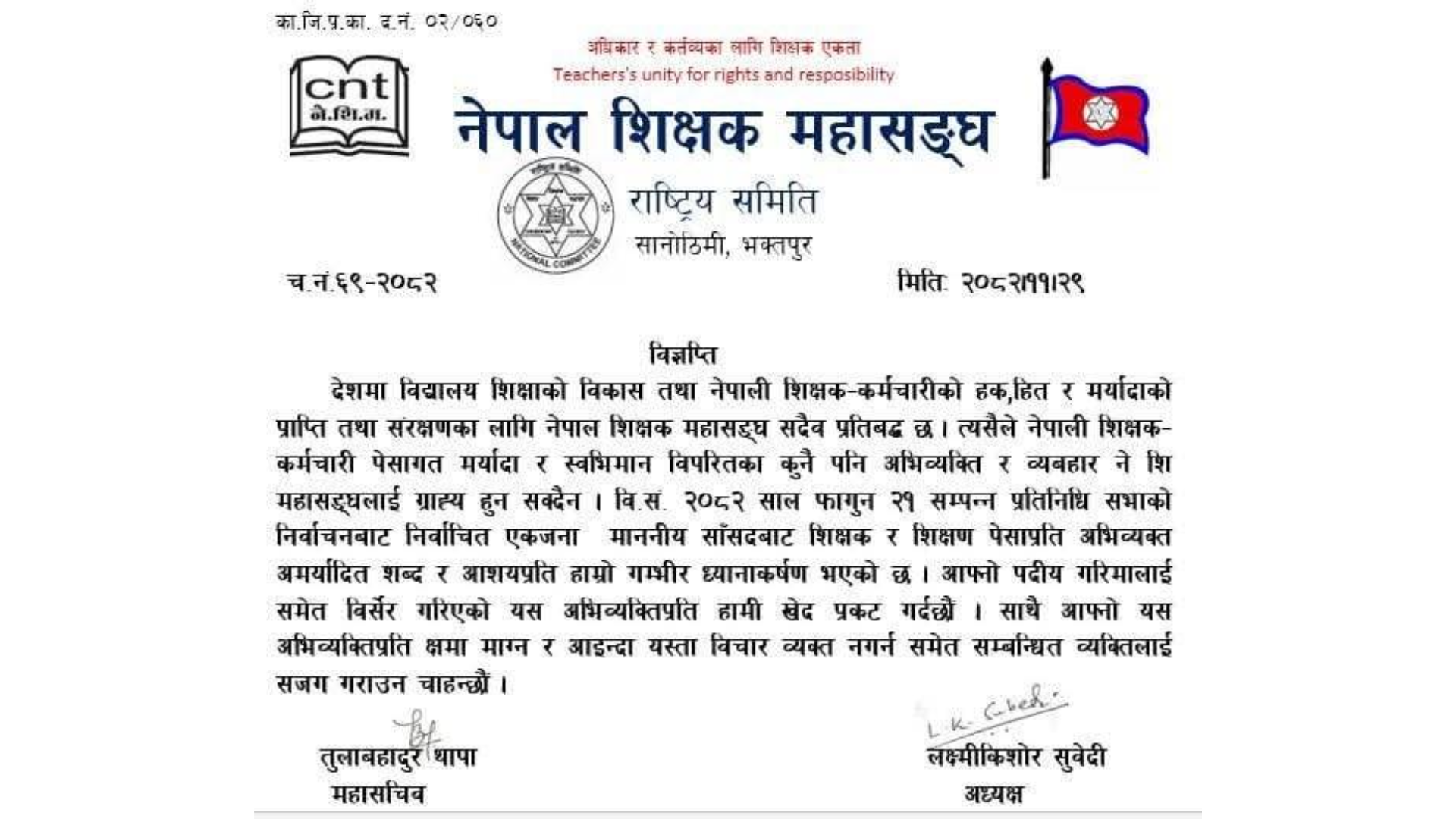 यो विवाद चर्किँदै गएपछि नेपाल शिक्षक महासंघले पनि औपचारिक रूपमा प्रतिक्रिया दिएको छ। महासंघका अध्यक्ष लक्ष्मीकिशोरी सुवेदीले विज्ञप्ति जारी गर्दै सांसद सुनारको अभिव्यक्तिप्रति आपत्ति जनाएका छन्। विज्ञप्तिमा पदको गरिमासमेत बिर्सेर गरिएको यस्तो टिप्पणीले शिक्षक समुदायको सम्मानमा ठेस पुगेको उल्लेख गर्दै सुनारलाई सार्वजनिक रूपमा माफी माग्न र भविष्यमा बोल्दा जिम्मेवारी बोध गर्न चेतावनी दिइएको छ।