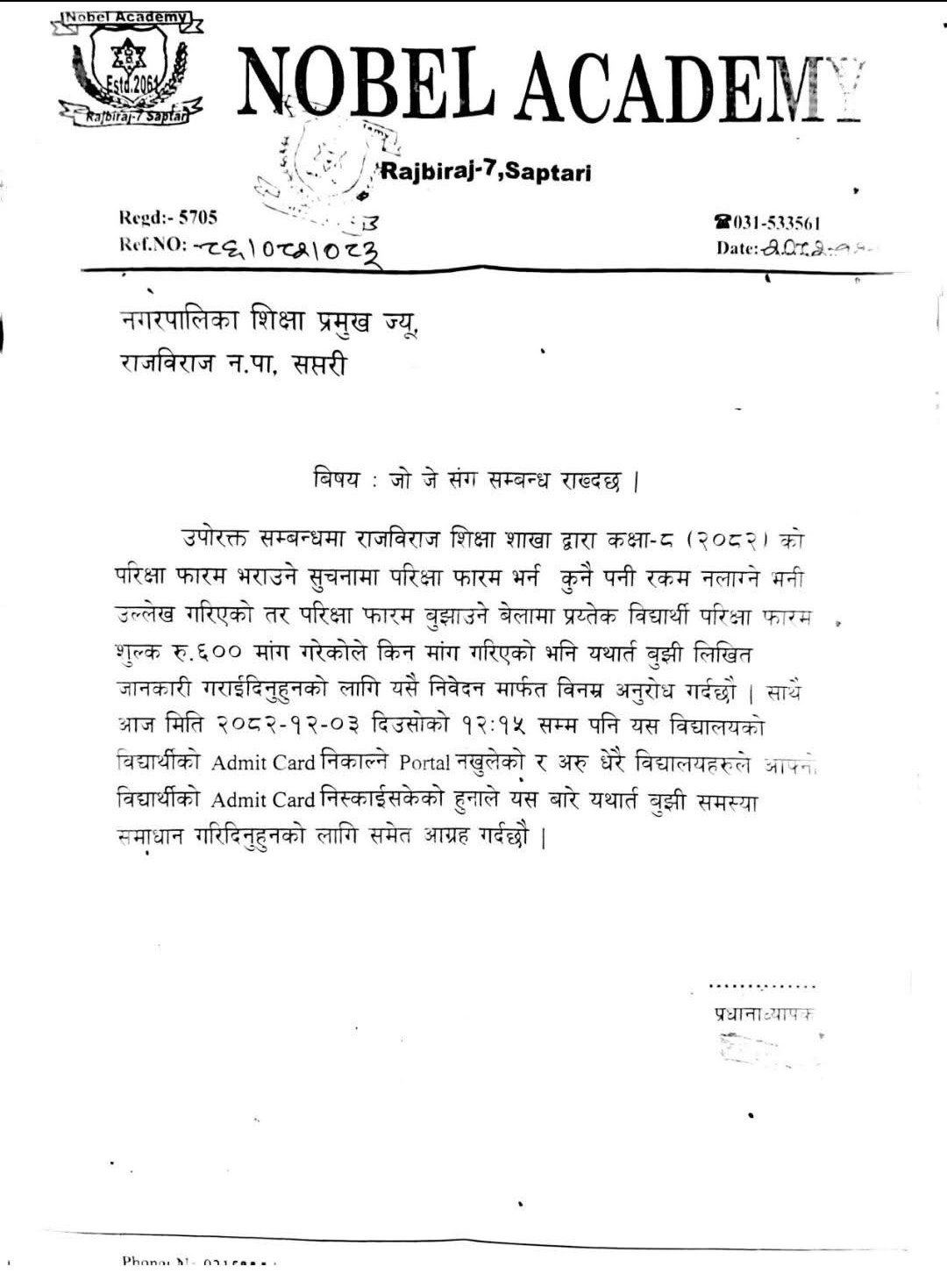 सामाजिक सञ्जालमा भाइरल भएका रसिदहरूले यो प्रकरणलाई सतहमा ल्याएको छ। नगरस्तरीय आधारभूत विद्यालय तह (कक्षा ८) को परीक्षा शुल्क भन्दै विद्यार्थीसँग रकम उठाइएको प्रमाण सार्वजनिक भएसँगै शिक्षा शाखाको नियतप्रति गम्भीर शंका मात्र होइन, स्पष्ट आरोप स्थापित भएको छ। यसबीच, नोवेल एकेडेमीले शिक्षा शाखालाई लेखेको पत्रले झन् ठूलो विस्फोट गरिदिएको छ, जहाँ ‘नगरपालिकाले शुल्क नलिने निर्णय गरेको अवस्थामा किन ६ सय रुपैयाँ मागिएको हो?’ भन्ने प्रश्न उठाइएको छ।