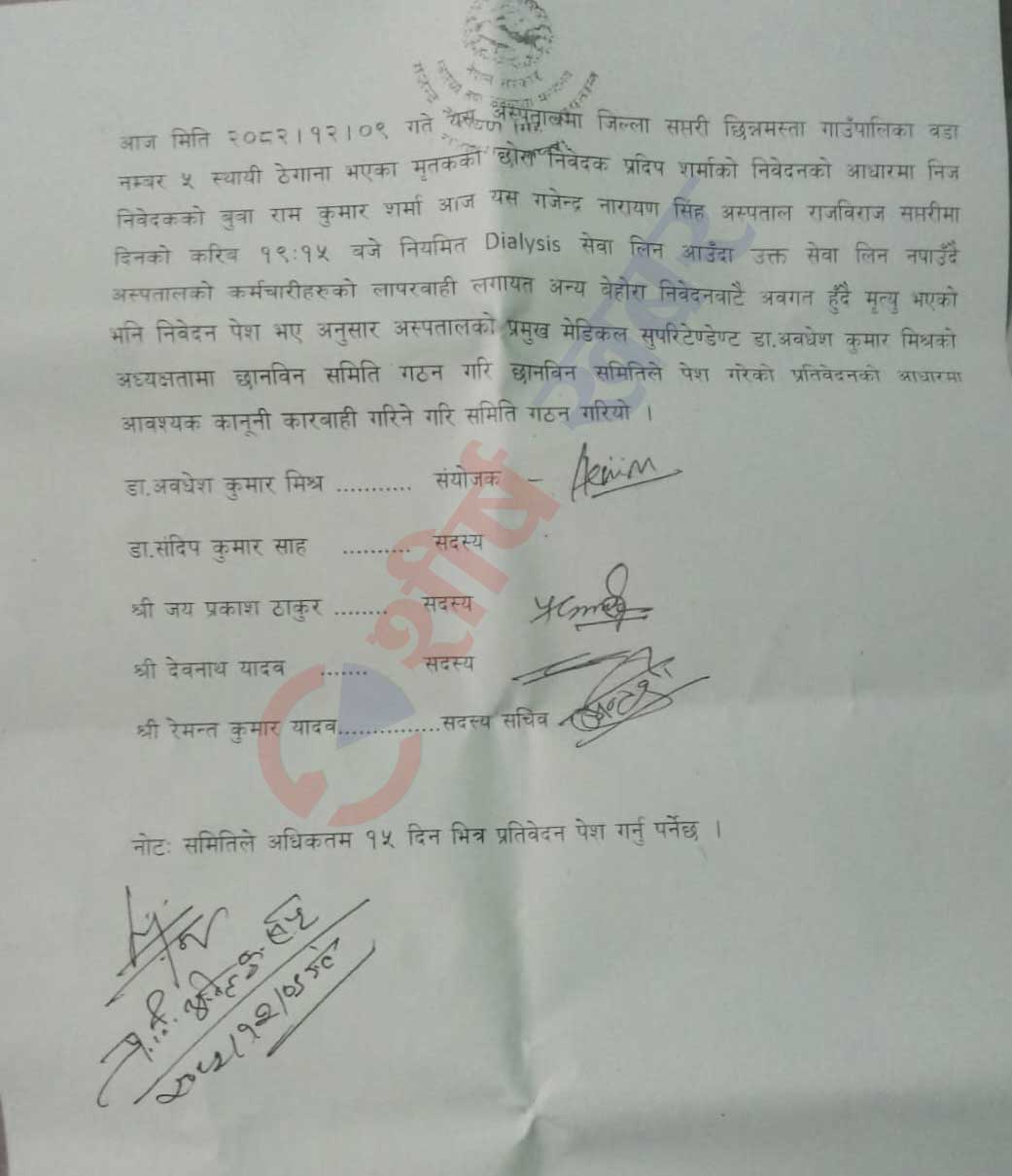 घटनाको गम्भीरता बुझ्दै अस्पताल प्रशासनले तत्काल छानबिन समिति गठन गरेको छ। अस्पतालका प्रमुख मेडिकल सुपरिटेन्डेन्ट डा. अवधेशकुमार मिश्रको अध्यक्षतामा गठित उक्त समितिमा डा. सन्दीप कुमार साह, जयप्रकाश ठाकुर दिवनाथ यादव सदस्य छन्।