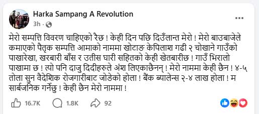 सामाजिक सञ्जालमा पछिल्ला दिनहरूमा उच्च पदस्थ राजनीतिक नेतृत्व र मन्त्रीहरूको सम्पत्ति विवरण सार्वजनिक भएपछि उठेको बहसलाई संकेत गर्दै उनले आफ्नो प्रतिक्रिया सार्वजनिक गरेका हुन्। विशेषगरी ठूला आर्थिक विवरण र लगानीबारे प्रश्न उठिरहेका बेला उनले आफ्नो पारदर्शिता देखाउन यो जानकारी सार्वजनिक गरेको बताएका छन्।