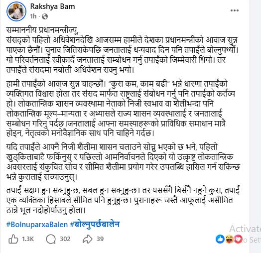 बुधबार सामाजिक सञ्जाल फेसबुकमार्फत आफ्नो धारणा सार्वजनिक गरेकी बमले प्रधानमन्त्रीको भूमिकालाई केवल प्रशासनिक काममा सीमित नगरी लोकतान्त्रिक उत्तरदायित्वसँग जोड्नुपर्ने स्पष्ट संकेत दिएकी छन्। ‘निर्वाचन जितेपछि जनतालाई धन्यवाद दिनु मात्रै होइन, संसदमार्फत राष्ट्रलाई सम्बोधन गर्नु प्रधानमन्त्रीको कर्तव्य हो,’ भन्दै उनले प्रधानमन्त्रीको मौनतालाई लोकतान्त्रिक संस्कारविपरीत भएको टिप्पणी गरेकी छन्। ‘कुरा कम, काम बढी’ भन्ने व्यक्तिगत धारणा राज्य सञ्चालनको आधार बन्न नसक्ने उनको ठम्याइ छ।