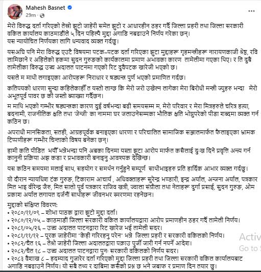 मुद्दासम्बन्धी विवरण प्रस्तुत गर्दै उनले २०८० सालदेखि २०८३ सालसम्मका विभिन्न चरणमा दायर उजुरी, तामेली निर्णय, अदालतको आदेश र सरकारी वकिल कार्यालयका निर्णयहरू उल्लेख गर्दै सबै प्रक्रियामा आफ्नो पक्षमा कानुनी निष्कर्ष आएको दाबी दोहोर्याएका छन्।