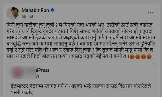 यही प्रकरणबीच पूर्वमन्त्री तथा स्वतन्त्र सांसद महाबीर पुनले अत्यन्त कडा प्रतिक्रिया जनाउँदै सांसद पोखरेललाई तत्काल बर्खास्त गर्नुपर्ने माग अघि सारेका छन्। सामाजिक सञ्जालमार्फत उनले व्यक्त गरेको धारणा केवल व्यक्तिगत असन्तोष मात्र नभई समग्र राजनीतिक संस्कारप्रतिको निराशा झल्काउने खालको छ। पुनले स्पष्ट शब्दमा भनेका छन्–यदि आफू उक्त सांसदको पार्टी नेतृत्वमा भएको भए तत्कालै पदमुक्त गरेर घर पठाउने निर्णय गर्थे।