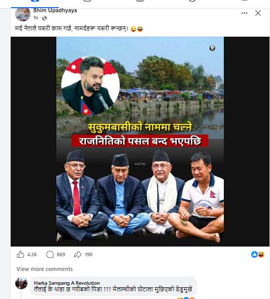 उपाध्यायको पोष्ट र हर्कको कमेण्टले सुकुम्बासी मुद्दा, राजनीतिक दृष्टिकोण र व्यक्तिगत आरोप–प्रत्यारोपलाई फेरि एकपटक तातो बहसको केन्द्रमा ल्याएको छ। उपाध्यायले सामाजिक सञ्जालमा नेपाली कांग्रेसका पूर्वसभापति शेरबहादुर देउवा, एमाले अध्यक्ष केपी शर्मा ओली, नेकपाका अध्यक्ष पुष्पकमल दाहाल ‘प्रचण्ड’ र हर्क साम्पाङको एआईबाट तयार पारिएको रुँदै गरेको तस्बिर सार्वजनिक गर्दै ‘मर्द नेताले यसरी काम गर्छ, नामर्दहरू यसरी रून्छन्’ भन्ने टिप्पणी गरेका थिए।